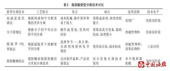 綜上所述,對幾種脂肪酸的新型分離技術(shù)進(jìn)行了匯總,從表2可以看出,幾種新型分離方法均有各自的優(yōu)缺點(diǎn)及適用范圍。同時(shí)高速逆流色譜法、分子蒸餾法、脂肪酶輔助法均處于實(shí)驗室階段,超臨界CO2萃取法技術(shù)水平達到工業(yè)應用。