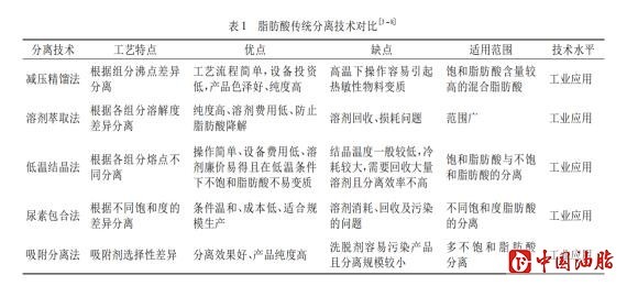 傳統分離飽和脂肪酸及不飽和脂肪酸的技術(shù)主要包括減壓精餾法、溶劑萃取法、低溫結晶法、尿素包合法、吸附分離法等,詳細對比見(jiàn)下表1。