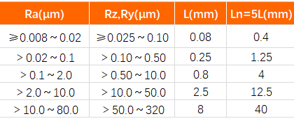 Ra、Rz、Ry的取樣長(cháng)度L與評定長(cháng)度Ln選用值
