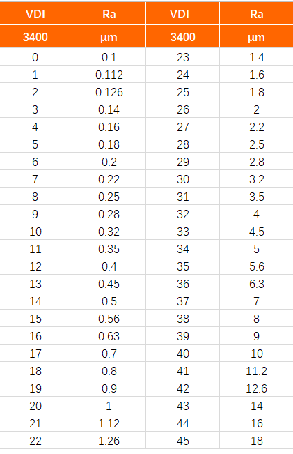 VDI3400表面與常用標準Ra有著(zhù)對應關(guān)系,不少人經(jīng)常要去查資料找對應的值,下面這份表格很全,推薦收藏。