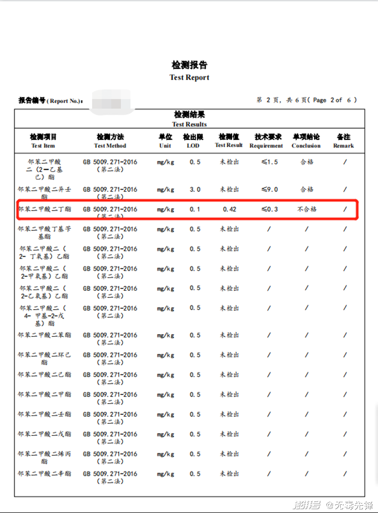DEHP檢出的最大值為 1.43mg/kg,未超標;DBP檢出的最大值為0.46 mg/kg,超標0.5倍,DINP無(wú)檢出。