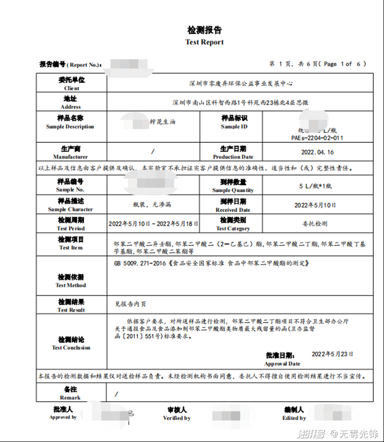 為了解網(wǎng)售食用油中所含鄰苯的情況,也為避免消費者購買(mǎi)到含鄰苯超標的食用油,無(wú)毒先鋒于2022年5-7月,在京東和拼多多上,以“食用油”做為關(guān)鍵詞進(jìn)行搜索,并按銷(xiāo)量排名,選取銷(xiāo)量靠前的共計10件不同品牌和種類(lèi)的成人油,送至具有檢測資質(zhì)的第三方獨立檢測機構,進(jìn)行3 種鄰苯(DEHP、DINP、DBP)含量的測定。相關(guān)結果如下: