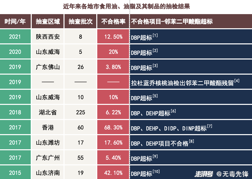 《市場(chǎng)監管總局關(guān)于食品中“塑化劑”污染風(fēng)險防控的指導意見(jiàn)》(國市監食生【2019】214號)也提到:油脂類(lèi)食品中鄰苯二甲酸二(α-乙基己酯)(DEHP)、鄰苯二甲酸二異壬酯(DINP)、鄰苯二甲酸二丁酯(DBP)最大殘留量,分別為1.5 mg/kg、9.0 mg/kg、0.3 mg/kg。