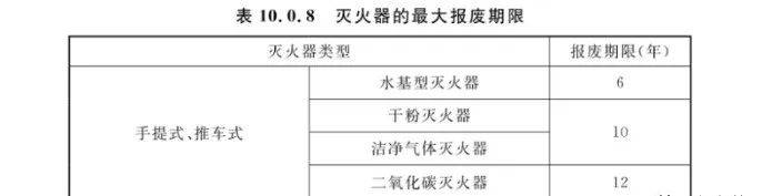 滅火器出廠(chǎng)時(shí)間達到或超過(guò)GB 50444-2008《建筑滅火器配置驗收及檢查規范》表5.4.3規定的報廢期限時(shí)應報廢。