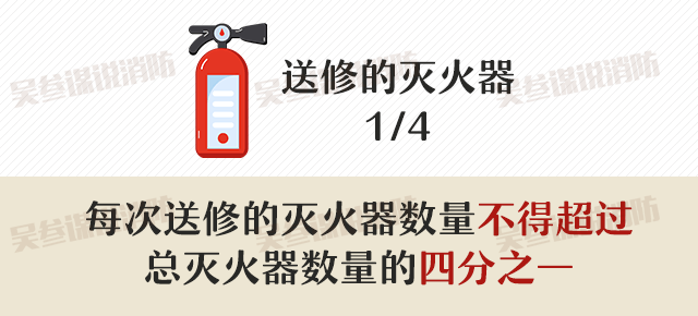 不僅滅火器的維修、再充裝應由已取得維修許可證的專(zhuān)業(yè)單位承擔,而且為了保證安全,每次送修的滅火器數量不得超過(guò)總滅火器數量的四分之一。超出時(shí),應選擇相同類(lèi)型和操作方法的滅火器替代,替代滅火器的滅火級別不應小于原配置滅火器的滅火級別。