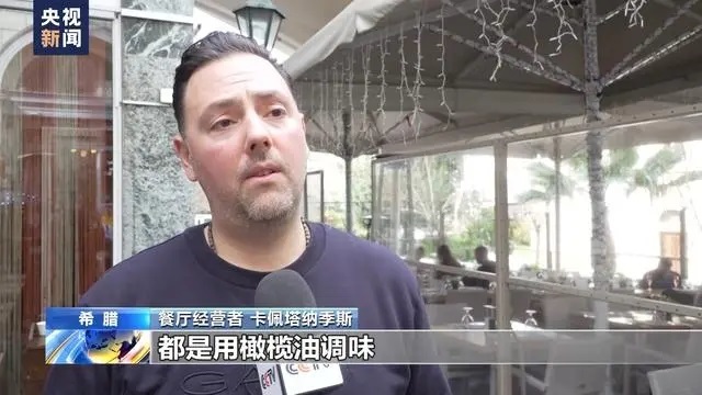 餐廳經(jīng)營(yíng)者 卡佩塔納季斯:不論你想要點(diǎn)什么食物,酸奶黃瓜醬、希臘烤肉,都是用橄欖油調味。任何希臘傳統食物都與橄欖油有關(guān)。